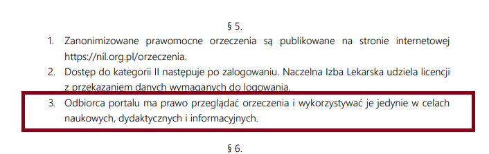 - W § 5 ust.3 ogranicza się nawet samą przydatność Portalu poprzez zastrzeżenie, że „Odbiorca portalu ma prawo przeglądać orzeczenia i wykorzystywać je jedynie w celach naukowych, dydaktycznych i informacyjnych”. To ma oznaczać, że znalezionych tam tez nie można np.wykorzystywać do obrony przed sądem? To po co stworzono w ogóle ten Portal?